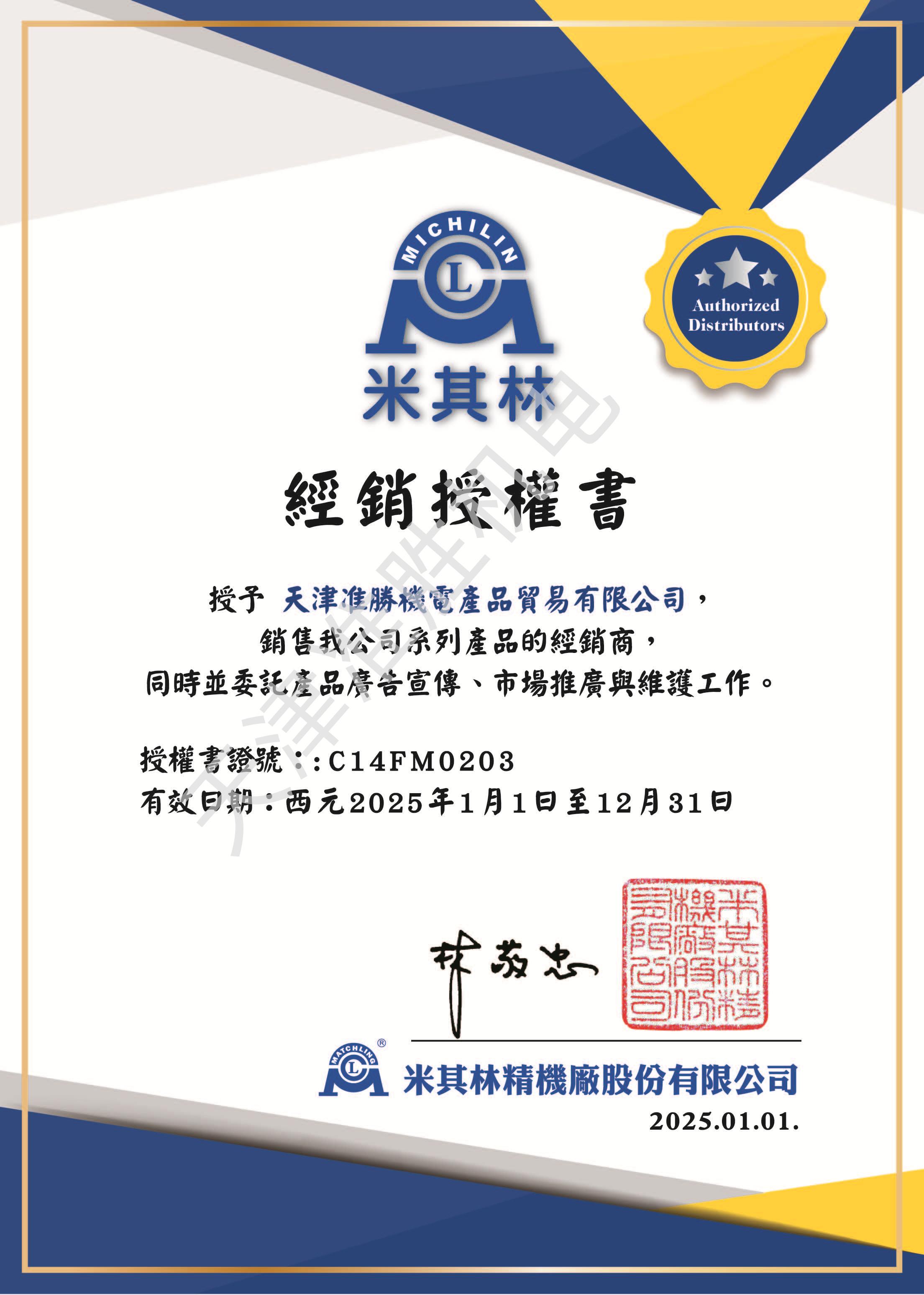 描述:臺灣米其林精密工具大陸一級代理授權(quán)證書