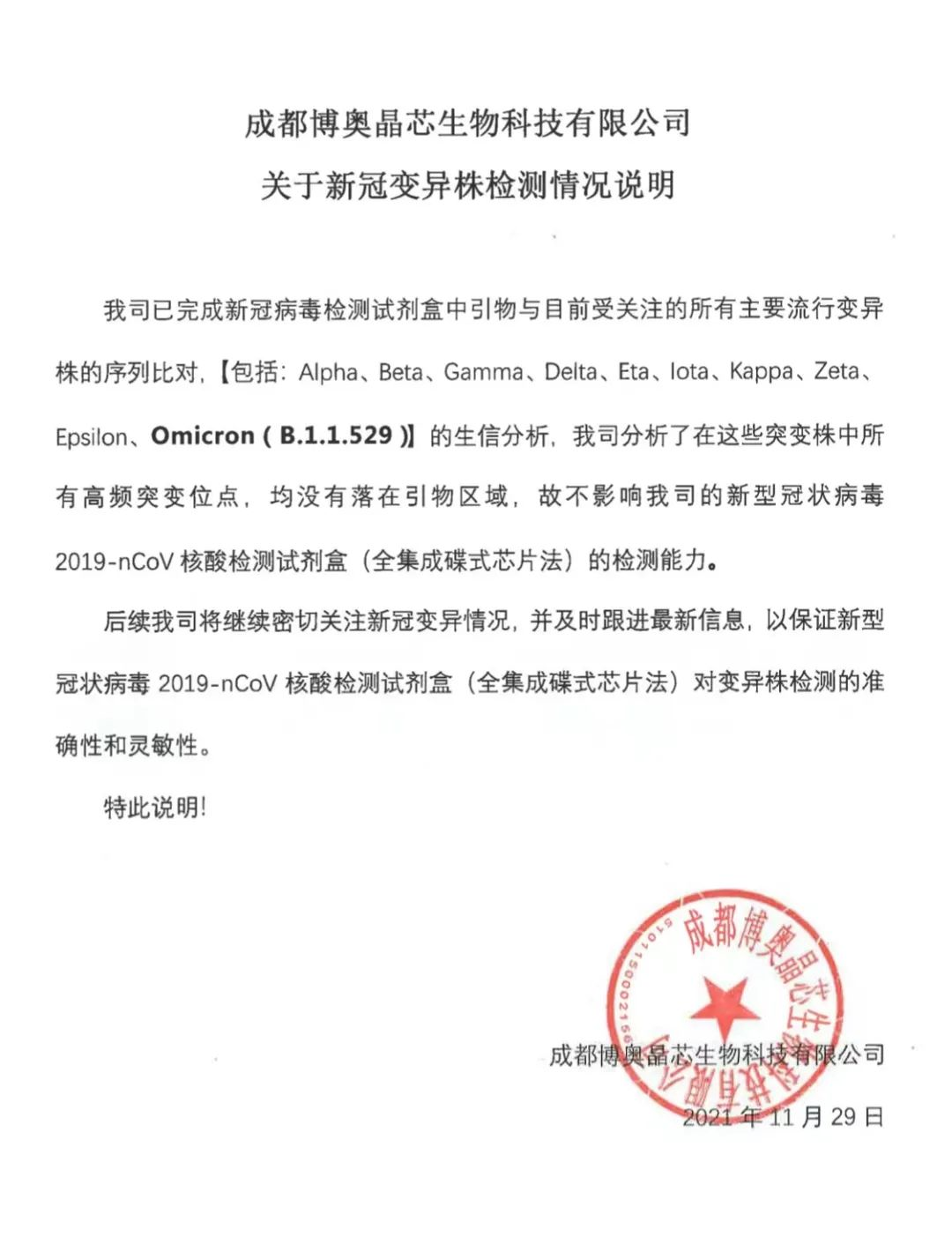 目前,旗下成都博奧晶芯生物科技有限公司已完成新冠病毒檢測試劑盒中引物與目前主要流行變異株的序列比對【包括但不限于:Alpha、Beta、Gamma、Delta、Eta、Iota、Kappa、Zeta、Epsilon、Omicron(B.1.1.529)】,結(jié)果證實(shí):博奧已上市的新型冠狀病毒2019-nCoV核酸檢測試劑盒(全集成碟式芯片法),不會出現(xiàn)脫靶和漏檢的情況。后續(xù),博奧將持續(xù)緊密追蹤全球新冠病毒變異株的最新動態(tài)并及時(shí)跟進(jìn)最新信息,確保全集成新冠病毒核酸檢測芯片試劑盒對變異株檢測的準(zhǔn)確性和靈敏性。