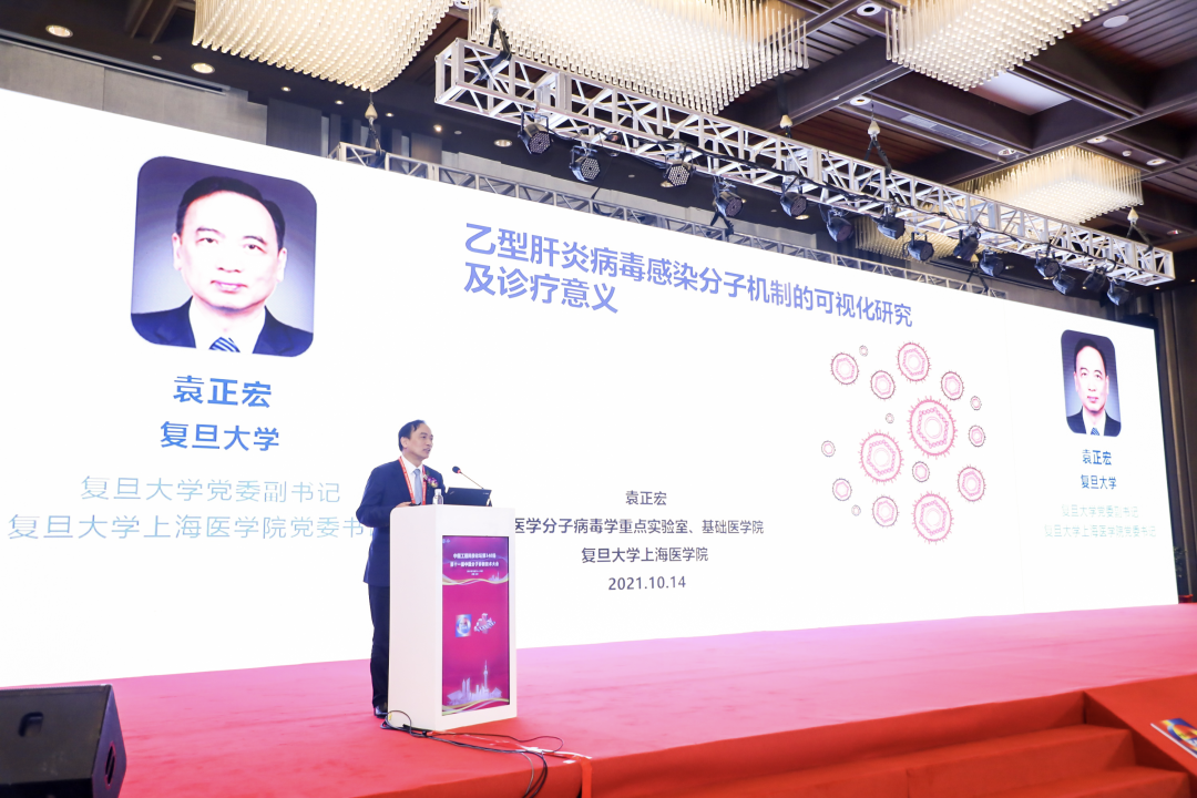 復(fù)旦大學(xué)黨委副書記、復(fù)旦大學(xué)上海醫(yī)學(xué)院黨委書記袁正宏教授作了題為《乙型肝炎病毒感染分子機制的可視化研究及診療意義》的專題報告。報告介紹了研究團隊利用基于 bDNA 的熒光原位雜交結(jié)合免疫熒光技術(shù)及 CRISPR-Tag 活細胞實時熒光失蹤技術(shù),系統(tǒng)性地建立了在體外細胞和組織系統(tǒng)進行原位雜交加熒光、顯色檢測HBV核酸和蛋白可視化的方法。通過可視化技術(shù),研究團隊在亞細胞水平直接觀察到HBV病毒組分,揭示了HBV病毒部分關(guān)鍵復(fù)制環(huán)節(jié)的細節(jié),填補了HBV生活史一些關(guān)鍵環(huán)節(jié)的時空信息。在組織水平觀察到病毒核酸與蛋白的分布特征,反應(yīng)肝臟內(nèi)HBV病毒的生活特征。課題組開發(fā)的可視化技術(shù)可以用來監(jiān)測慢乙肝患者抗病毒治療后病毒蛋白質(zhì)和核酸,尤其 cccDNA 的清除情況,有助于臨床醫(yī)生制訂更好的治療方案,并可為指導(dǎo)開發(fā)新藥物提供幫助。