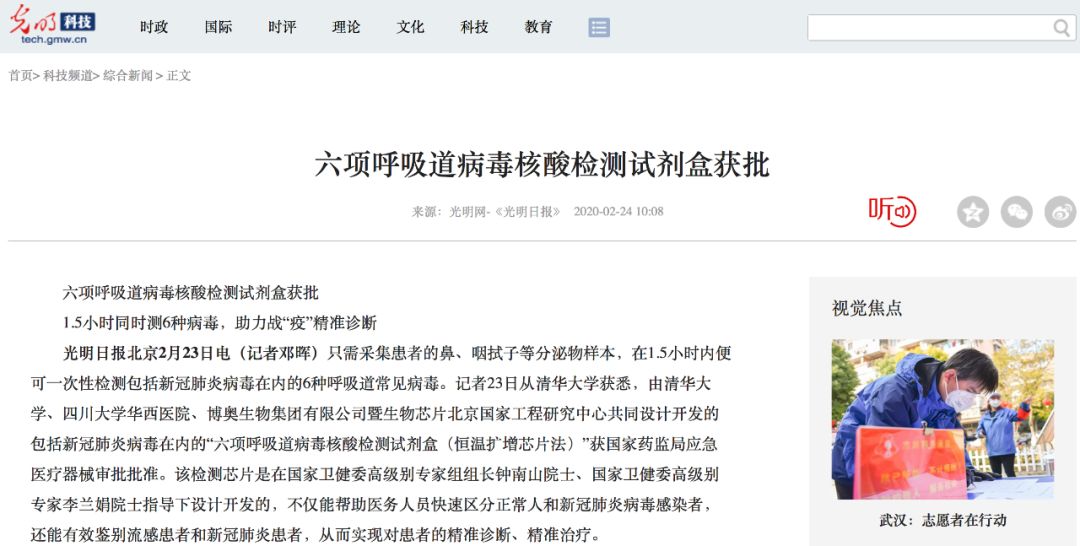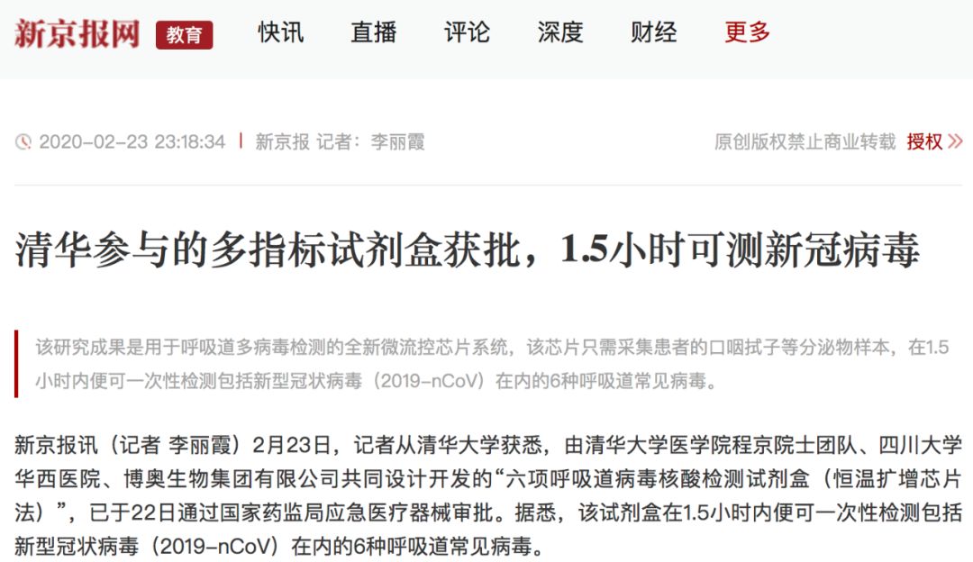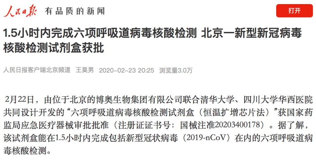 此次應急獲批的“六項呼吸道病毒核酸檢測試劑盒(恒溫擴增芯片法)”,是全球首個能在1.5小時內(nèi)檢測包括新型冠狀病毒(2019-nCoV)在內(nèi)的六項呼吸道病毒核酸檢測芯片試劑盒。