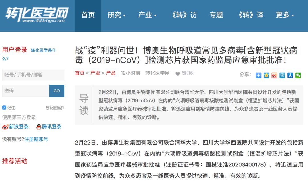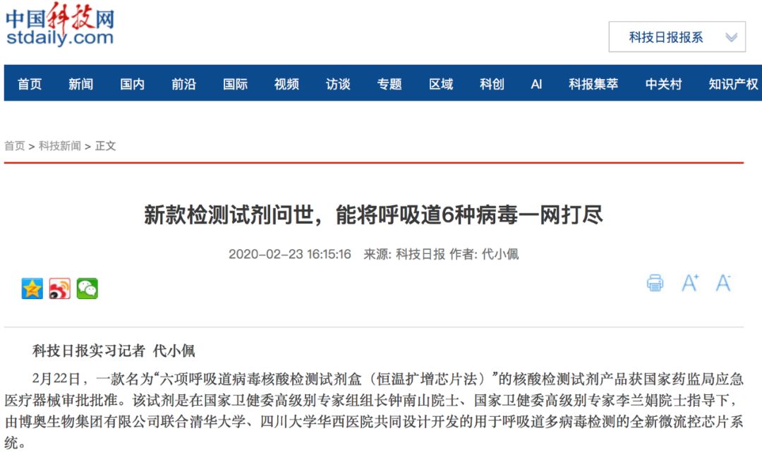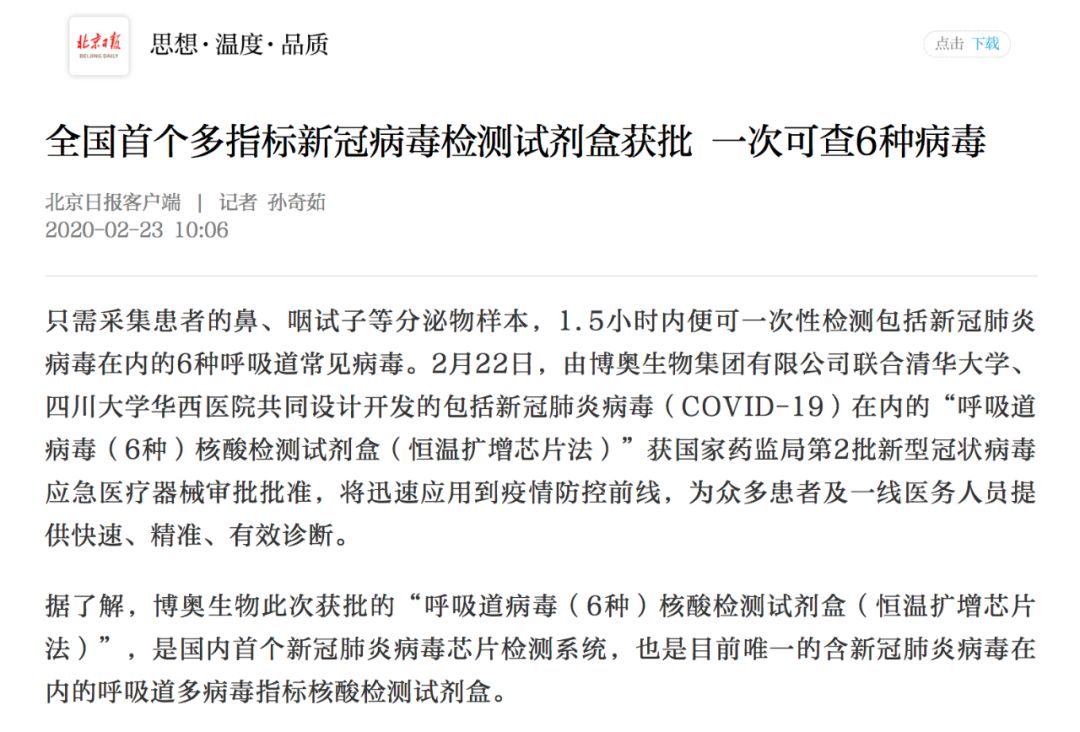 2月22日,由博奧生物集團有限公司聯(lián)合清華大學、四川大學華西醫(yī)院共同設計開發(fā)的包括新型冠狀病毒(2019-nCoV)在內(nèi)的“六項呼吸道病毒核酸檢測試劑盒(恒溫擴增芯片法)”獲國家藥監(jiān)局新型冠狀病毒應急醫(yī)療器械審批批準(注冊證編號:國械注準20203400178),將迅速應用到疫情防控前線,為眾多患者及一線醫(yī)務人員提供快速、精準、有效的診斷。