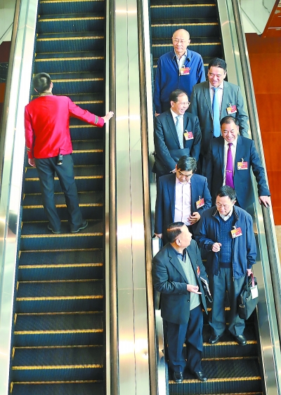 北京國際飯店,參加全國政協(xié)十二屆三次會議的委員們走向小組討論會場,在電梯上相互交流討論。