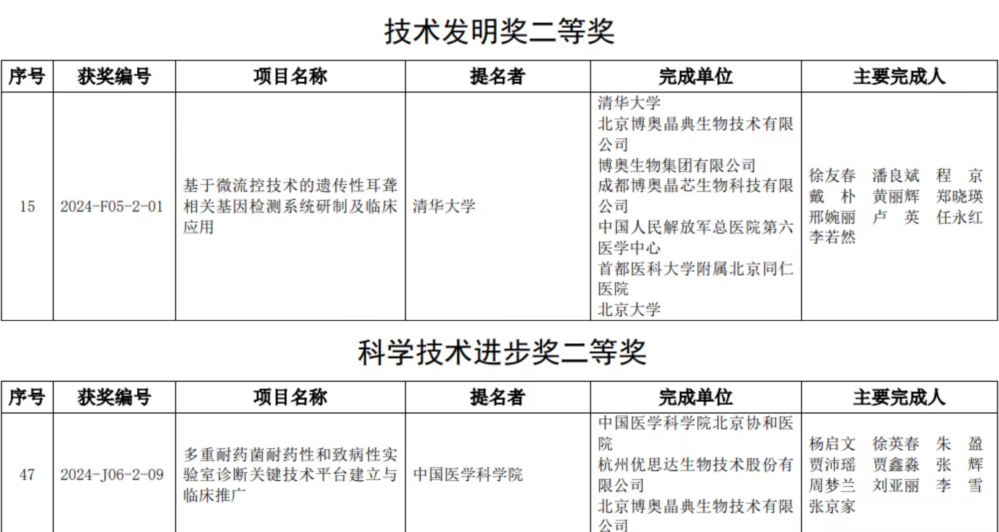 憑借一直以來構(gòu)建的“基礎(chǔ)研究+技術(shù)攻關(guān)+成果轉(zhuǎn)化”完整創(chuàng)新鏈條驅(qū)動(dòng)下的硬核創(chuàng)新實(shí)力,博奧在評(píng)選中脫穎而出,《基于微流控技術(shù)的遺傳性耳聾相關(guān)基因檢測(cè)系統(tǒng)研制及臨床應(yīng)用》榮獲技術(shù)發(fā)明獎(jiǎng)二等獎(jiǎng)、《多重耐藥菌耐藥性和致病性實(shí)驗(yàn)室診斷關(guān)鍵技術(shù)平臺(tái)建立與臨床推廣》榮獲科學(xué)技術(shù)進(jìn)步獎(jiǎng)二等獎(jiǎng)。