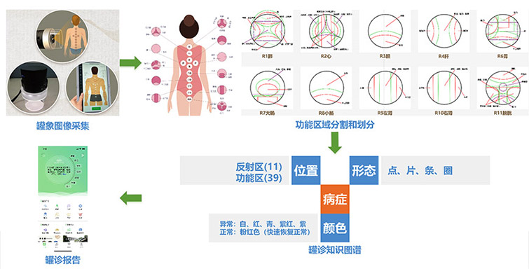 罐診是中醫(yī)診斷的重要手段之一,是在人體背部督脈、膀胱經(jīng)上的反應(yīng)點選取相應(yīng)的功能反應(yīng)區(qū)扣拔11罐,扣拔五分鐘后起罐形成的罐象結(jié)合中醫(yī)學(xué)說的寒熱虛實等來判斷人體五臟六腑的功能狀態(tài)?;诓W生物集團有限公司開發(fā)的罐診儀,研究院開發(fā)了基于人工智能的罐診信息系統(tǒng)。該系統(tǒng)通過罐象反射區(qū)和功能區(qū)圖像分割,根據(jù)各區(qū)域的形態(tài)和顏色特征,自動識別健康狀態(tài)和易患病癥,并形成罐診報告。